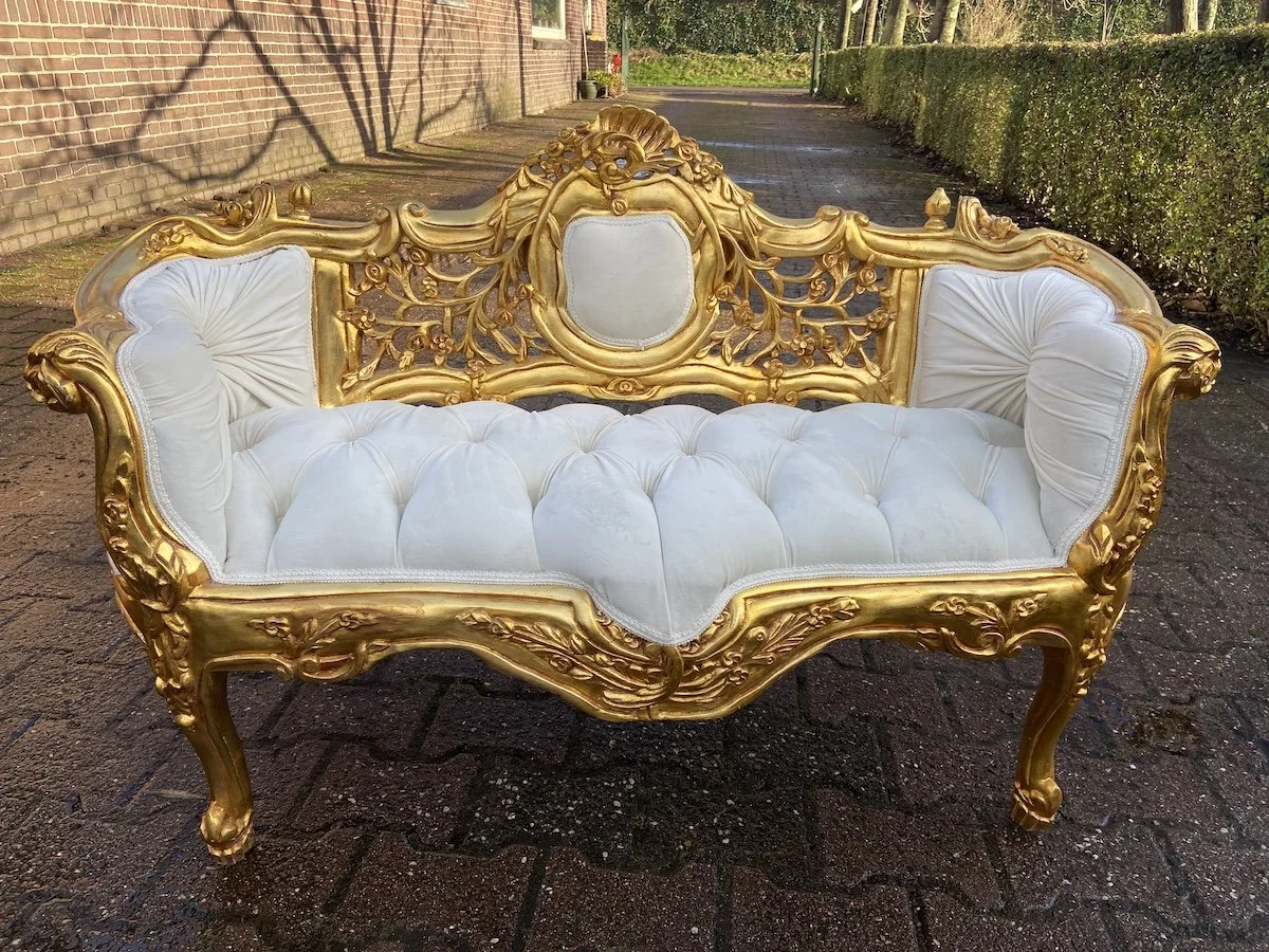 Add a touch of regal elegance to your home with this exquisite French Louis XVI style settee, beautifully handmade from beech wood and re-finished with luxurious gold leaf. This stunning piece is richly adorned with intricate hand-carved flowers and branches, making it a true eye-catcher in any space.