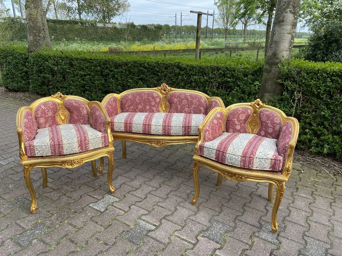 Recently restored to its original glory, this set was treated with authentic gold leaf to enhance its lustrous finish. The expert restoration also included new padding and filling for long-lasting comfort, making this vintage set feel both timeless and fresh.