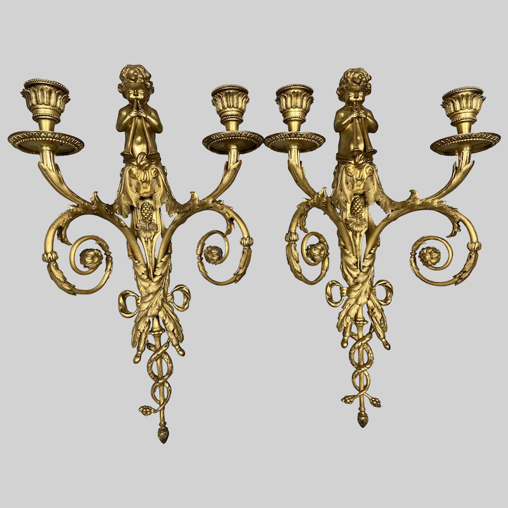 The quality of the maker can really be observed when looking at the faces of these Putti figurines and the fine relief of the base. The lively way in which the feathers are wrapped around the base of the items, the details that decorate even the base of the candleholders: all signs of truly breath-taking artistry. They are also unique in the fact that they carry two candles each rather than light bulbs. This makes them extra romantic and luxurious.